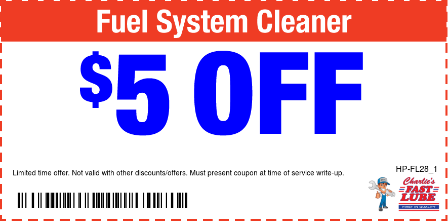 Good only atCharlie's Fast Lube Dexter Print coupon Offer details Fuel System Cleaner $5 OFF * See coupon for exclusions. Email Coupon First name * Last name * Email address * Sign me up to receive future text offers from Charlie's Fast Lube Dexter: Via Text Cell/Mobile Phone By clicking "I accept" below, I expressly agree to receive marketing text messages made by or on behalf of Charlie's Fast Lube Dexter to the telephone number(s) I’ve listed above. I understand that I may receive such text messages by the use of Automatic Telephone Dialing Systems (including “Predictive Dialers” or “Autodialers”) and I agree to receive them even if I have registered my number(s) with my state or federal Do-Not-Call list(s). I understand that such text messages will include advertising containing offers for goods or services and that I may revoke this consent at any time by telephone, return text message or by Visiting charliesfastlubedexter.com/stop to unsubscribe. Message and data rates may apply. I also understand that I am NOT required to provide this consent as a condition of purchasing goods or services. I accept View: Text Specials Terms and Conditions with this link.
